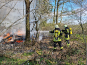 Gegen 13:37 Uhr wurde der Löschzug West zu einem Brand in einem Waldstück im Ortsteil Donsbrüggen alarmiert. Am Ende eines Wirtschaftsweges war ein Imkerstand mit mehreren Bienenkästen in Brand geraten. Das Feuer hatte bereits auf die umliegende Vegetation übergegriffen. Es wurde umgehend mit den Löscharbeiten begonnen.