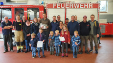 Eigentlich hatten sich die Mitglieder der Löschgruppe Reichswalde am Samstagmorgen zum Gerätedienst getroffen, als Stefanie Rambach und Simone Frantzen vom Förderkreis der Grundschule zusammen mit der Schulleiterin Anna Janßen und einigen Schulkindern das Feuerwehrhaus besuchten. Im Gepäck hatten Sie eine Überraschung für die Feuerwehrleute: Nach dem erfolgreichen Einsatz beim Brand der St.-Michael-Grundschule im Juni 2022 hatte der Schulbetrieb sofort nach den Sommerferien wieder aufgenommen werden können. Zum Dank gab es von den Kindern ein tolle Danksagung mit Unterschriften aller Schüler. Vom Förderkreis gab es noch ein Präsent. Da fehlten selbst den gestandensten Feuerwehrleuten die Worte.